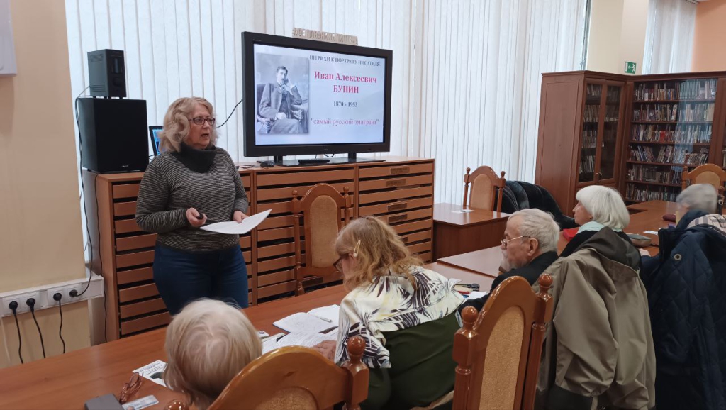 Ведущая рассказала о том, что Иван Бунин первым среди русских писателей был удостоен Нобелевской премии в области литературы в 1933 году. Мероприятие прошло в сопровождении презентации "Иван Бунин. Жизнь и творчество, путешествия и награды".