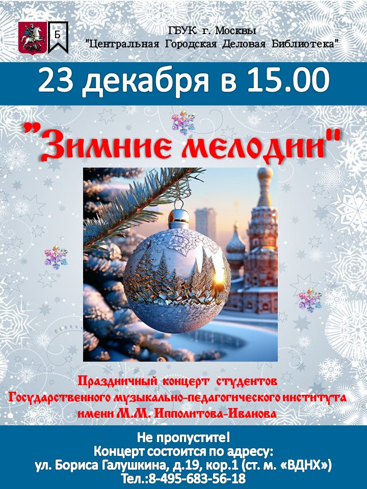 23 декабря в 15:00 Центральная Городская Деловая Библиотека приглашает гостей на праздничный новогодний концерт.
